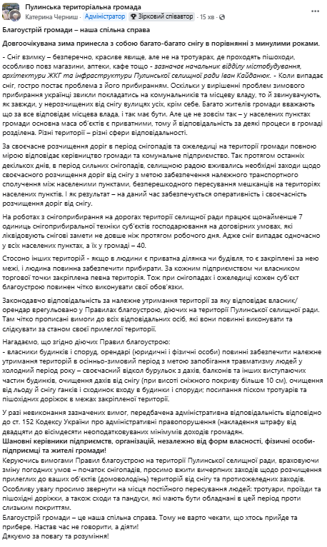 У соціальних мережах з'явилося повідомлення від керівництва Пулинської селищної ради на тлі рясних снігопадів. Замість звичного звіту про виконану роботу, влада наголошує на спільній відповідальності та чітко розмежовує, хто і за що має прибирати сніг.